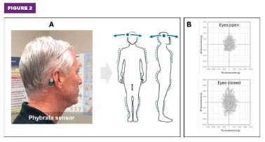 Figure 2. (A) The Phybrata sensor detects and analyzes subtle head and body micromovements during balance and gait tests. (B) Example two-dimensional acceleration data captured during a pair of one-minute eyes open and eyes closed standing balance tests.