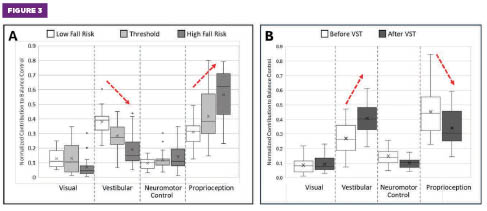 Figure 3. (A) Phybrata sensory reweighting (SR) plots for older adults (N = 516, aged 51 to 98) with increasing balance instability and fall risk reveal a consistent compensatory shift toward proprioceptive balance control as vestibular inputs weaken. (B) Phybrata SR plots for older adults (N = 32, aged 60 to 98) after completing the 18-session vestibular stimulation therapy balance restoration treatment reveal significant restoration of vestibular balance control and reduced reliance on proprioception.
