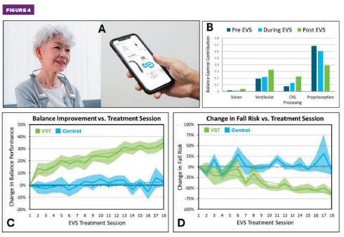 Figure 4. (A) Neurvesta device and mobile app. (B) Example SR measurements pre-, during, and post-electrical vestibular stimulation, revealing enhancement of vestibular function accompanied by decreased reliance on proprioception. (C) Measured balance improvements and (D) reduced fall risk for a randomized controlled trial of the 18-session vestibular stimulation therapy treatment protocol (50 participants, aged 50 to 95). Solid line denotes mean values, and shaded areas represent one standard deviation from the mean. Figures courtesy of Neursantys